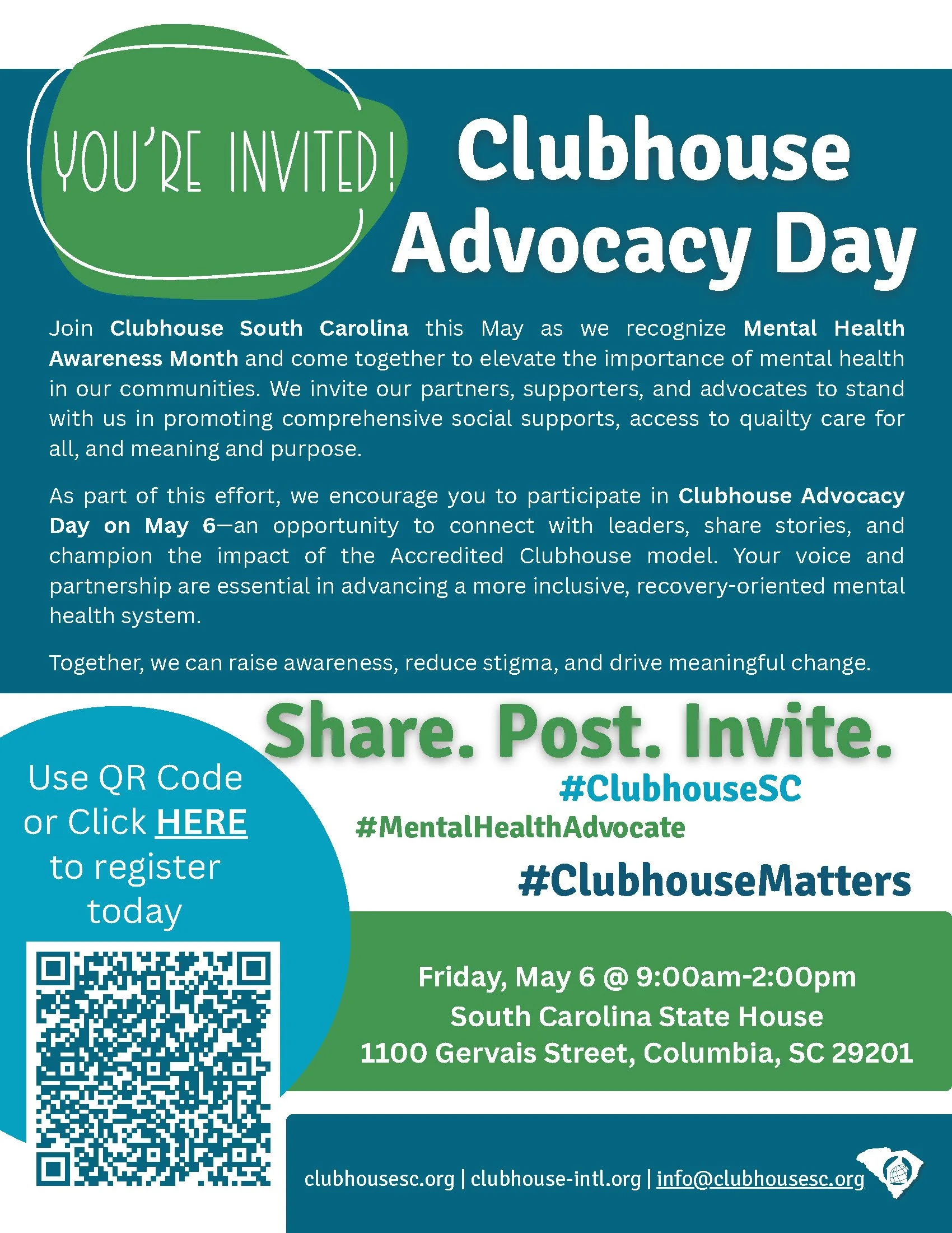 For Mental Health Awareness Month, Clubhouse SC is gathering at the statehouse for Clubhouse Advocacy Day on Wednesday May 6 at 9am.